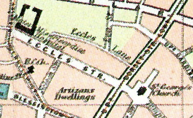 Detail of Bartholomew's Plan of Dublin, 1900. St. George's Church lies to the right of Dorset Street, Eccles Street to the left. Source: David Pierce, James Joyce's Ireland.