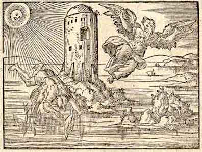 Virgil Solis, woodcut of Dedalus watching Icarus fall in Ovid:
