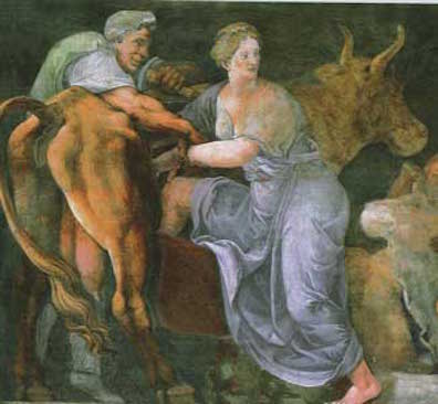 Oil painting by Giulio Romano, ca. 1530, showing Pasiphae