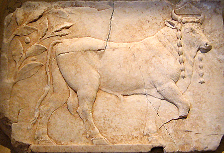 Roman marble relief sculpture of a bull garlanded for sacrifice,
