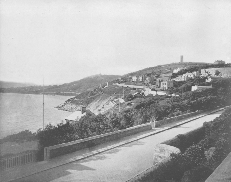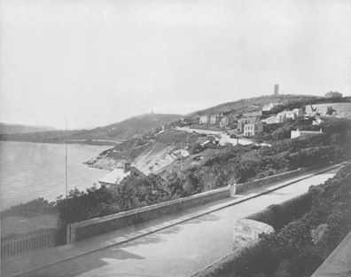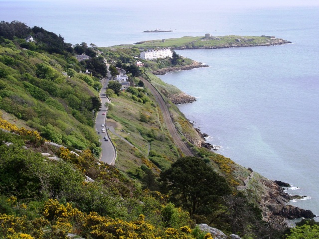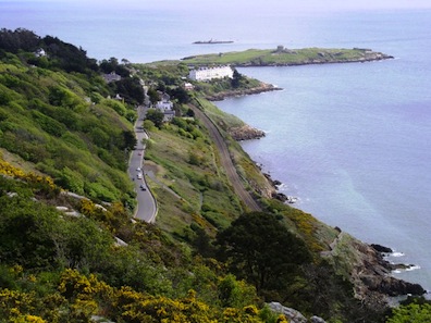Vico Road today, from the southwest. At the upper right lies Dalkey Island and beyond it the Muglins. Around the bend to the left are Dalkey, Bullock Harbor, Sandycove, Dun Laoghaire (formerly Kingstown), and ultimately Dublin. Source: www.geograph.ie.