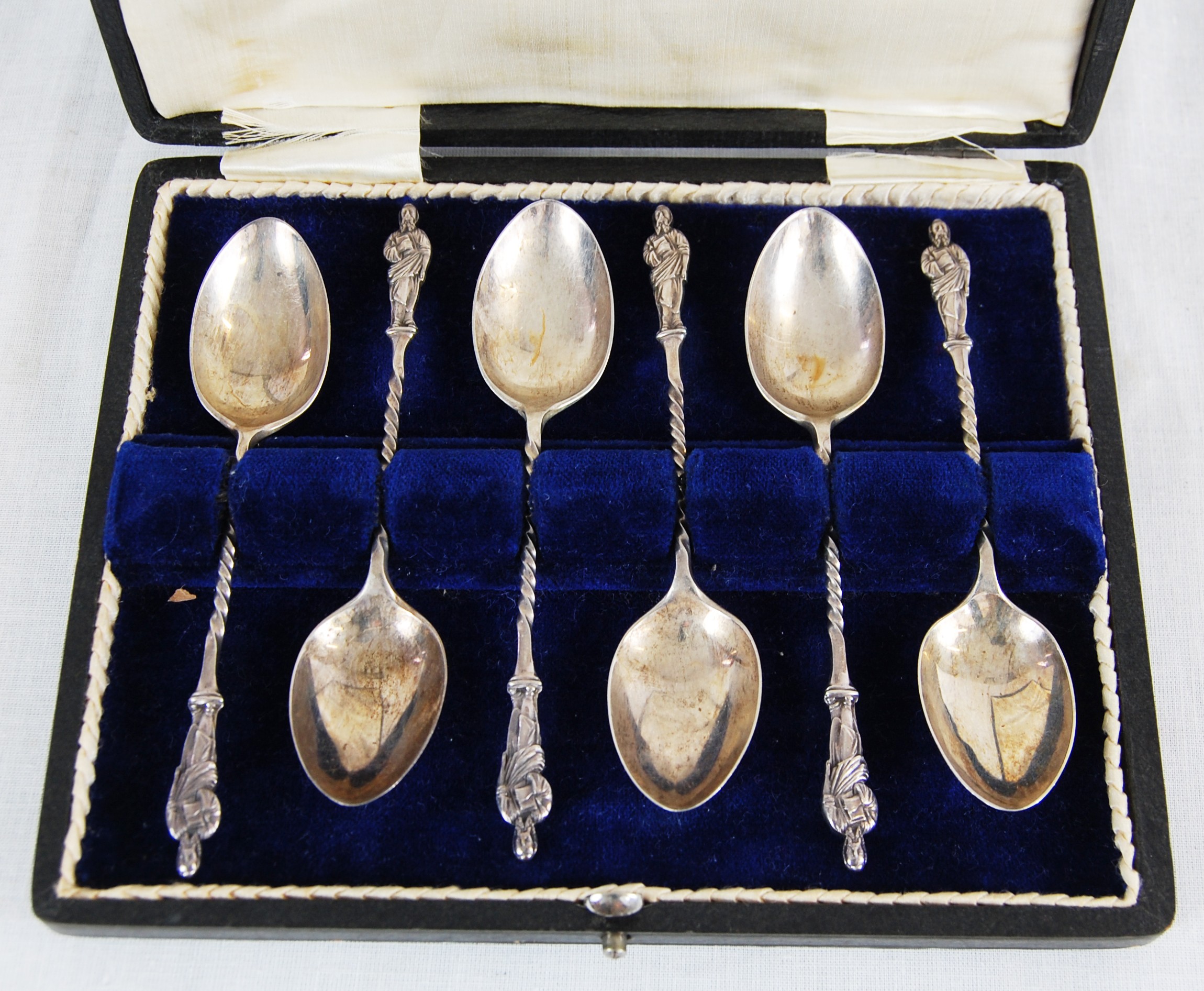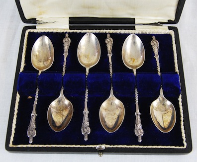 Set of 6 English silver apostle spoons, ca. 1880s-1920s, in their original box. Source: www.akibaantiques.com.