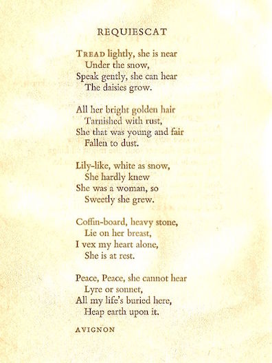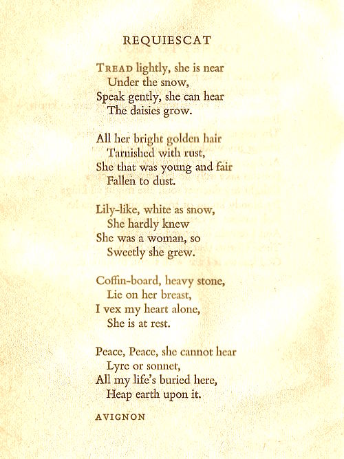 "May she rest (in peace)" (from the church prayer, Requiescat