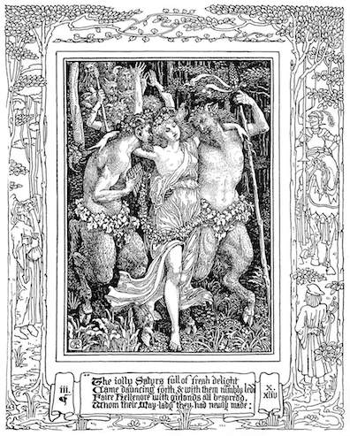 satyrs kiss Hellenore. Malbecco creeps closer, his sprouting