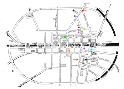 (moving northeast, away from the center of town) he would have