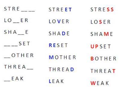 Fragments from a word-completion exercise, source unknown.