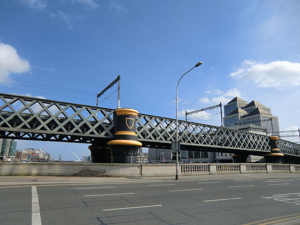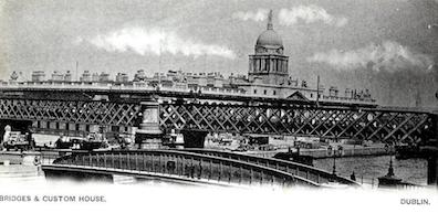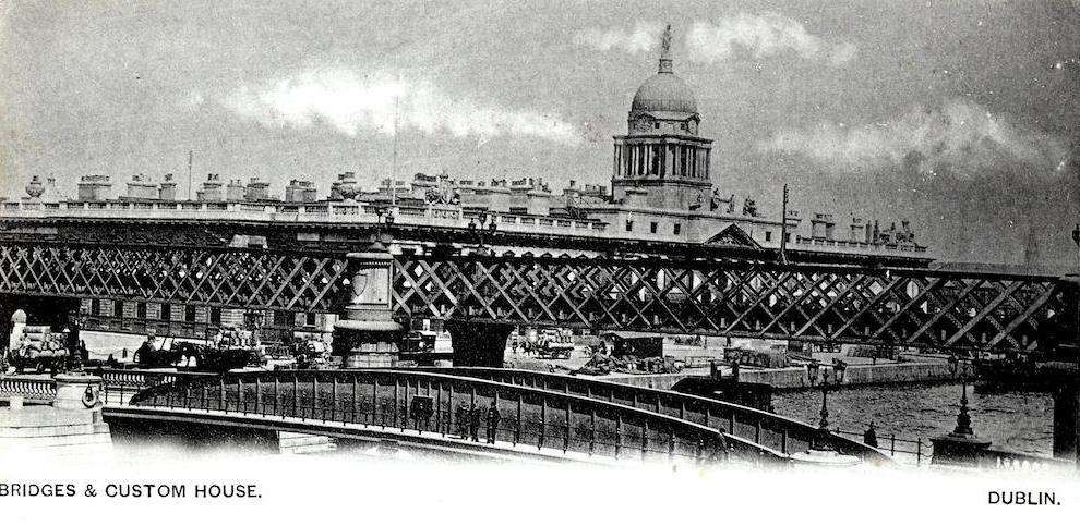 Photograph showing the old swiveling Butt Bridge in the foreground, the Custom House in the background, and the Loop Line bridge between them. Source: southdublinlibraries.ie.