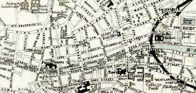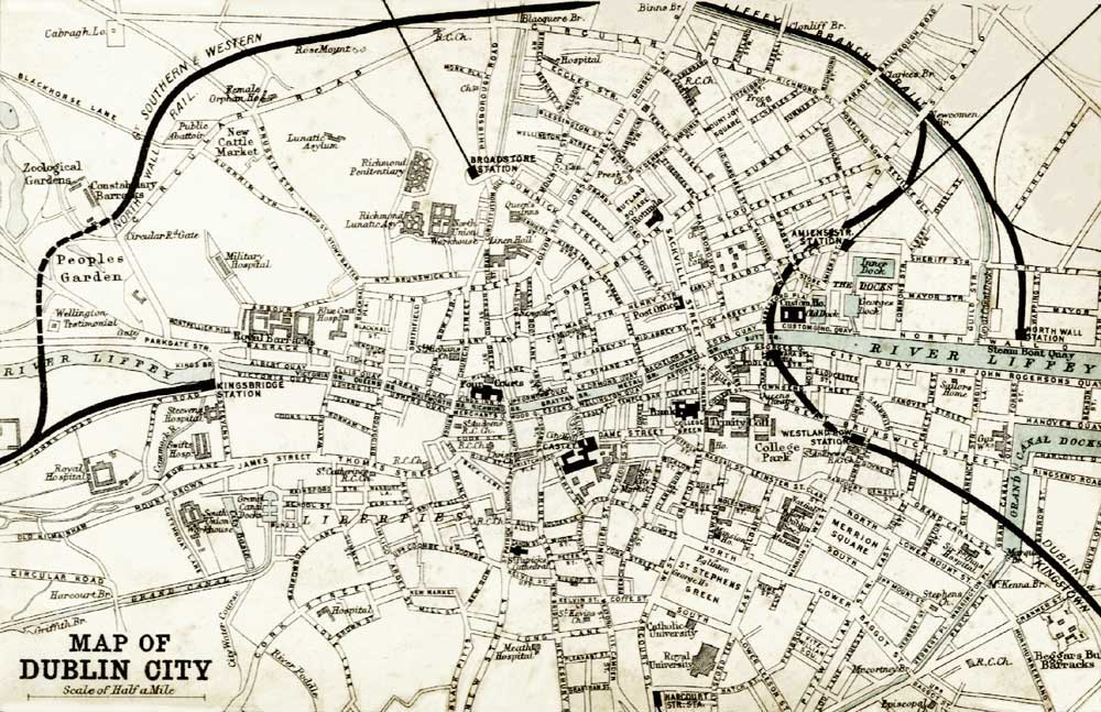 Detail from period map showing the Loop Line loop between the Westland Row and Amiens Street stations in dark black. Souce: www.gutenberg.org.