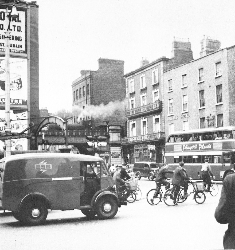 1950s photo by William York Tindall of the bridge from the corner of Great Brunswick Street and Westland Row, with a train heading to the nearby station. Source: The Joyce Country.