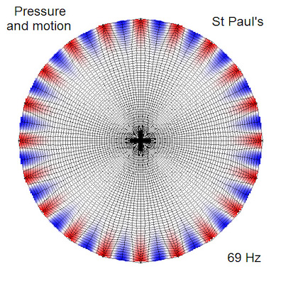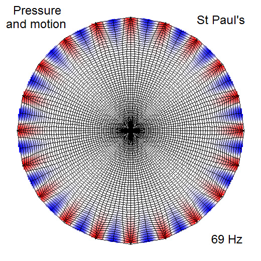 Map of a 69 Hz wave in a cylinder of air with the 33.7m diameter of the St. Paul's whispering gallery, created at the Applied Solid State Physics Laboratory of Hokkaido University Sapporo, Japan in 2012, with red and blue representing higher and lower air pressures, and distortion in the grid lines representing air particle displacements. Source: Wikimedia Commons.