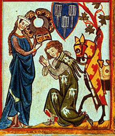 A medieval courtly lover abasing himself before his beloved in the feudal trope of "love service" initiated by the troubadour poets. Source: gynocentrism.com.