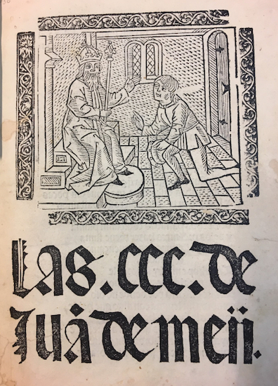 Woodcut print on the title page of Juan de Mena's 1499 work Las CCC, showing Juan doffing his cap to King John II. Source: blogs.bl.uk.