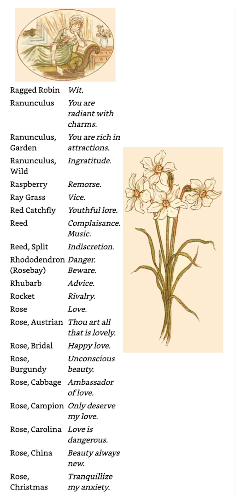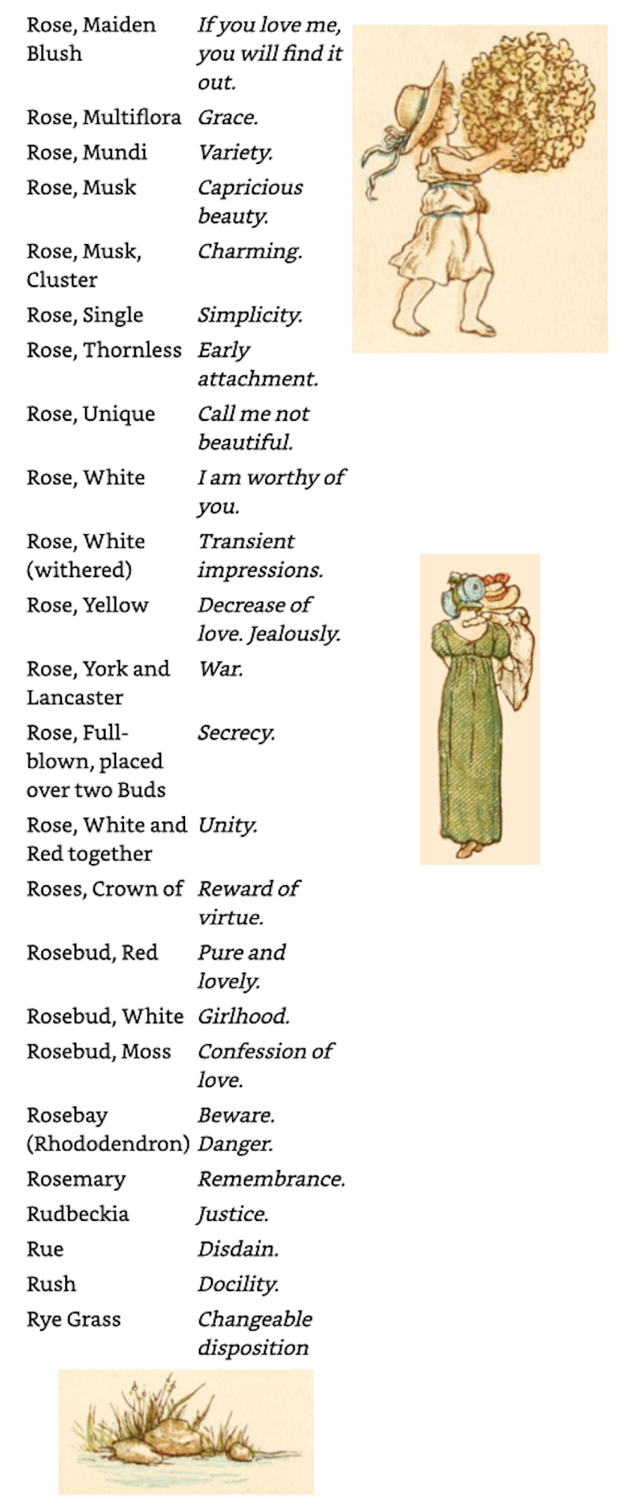 Two pages from Kate Greenaway's The Language of Flowers that show the many meanings attached to different varieties of roses. Source: www.gutenberg.org.