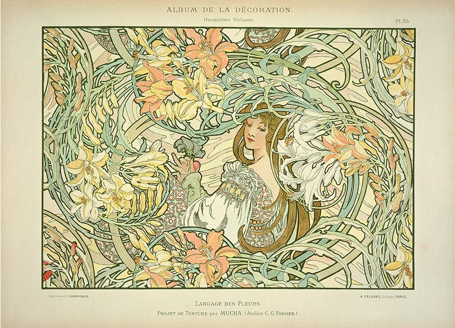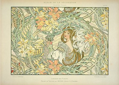 Language of Flowers, a color lithograph reproduced as plate 35 in Alphonse Mucha's Album de la Décoration (1900). Source: Wikimedia Commons.