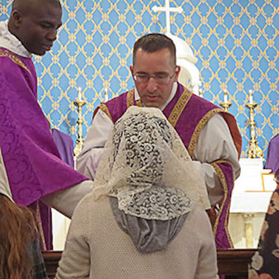 slipping wafers into the women's open mouths intones a sacred