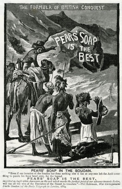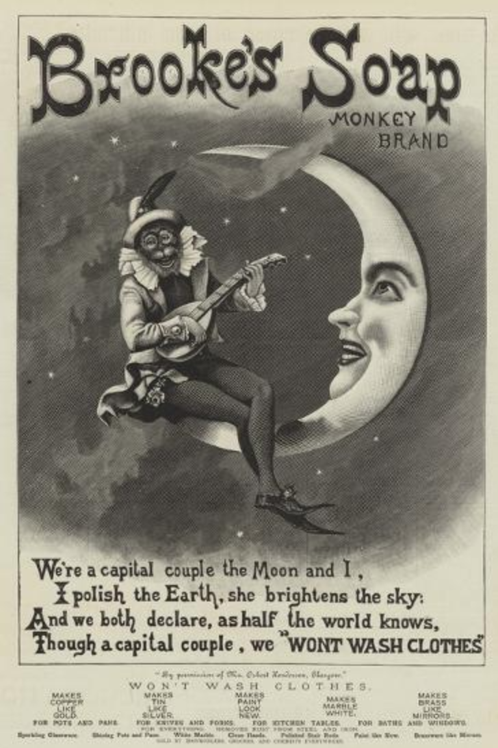 Kil's article raises another line of questioning whose implications are very murky, but probably worth mentioning. In 1899 the British firm Lever Brothers bought Brooke's Soap after noting its effectiveness in selling household soap, which British manufacturers had not previously bothered to advertise. In British hands the ads for Monkey Brand came to more closely resemble the Pears ads promising to civilize the dusky world. Did Joyce view the two soaps through the same colonialist lens? This seems possible, but Kil also suggests that he may have felt more sympathetic toward the company that produced the 1891 ad because it was American. The soap that Bloom carries around all day is Irish, and in Lestrygonians he thinks happily of giving Milly baths with an "American soap I bought: elderflower." When the Irish soap diffuses light and perfume about the sky and proclaims in an American spirit that "We're a capital couple are Bloom and I," could it possibly be evoking independence from colonial domination rather than submission to it? This is one of several tantalizing questions raised, but hardly answered, by the novel's engagement with soap ads.