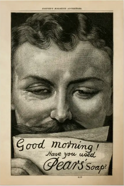 the ad for Pears' soap, and when he finally gets free of Lyons