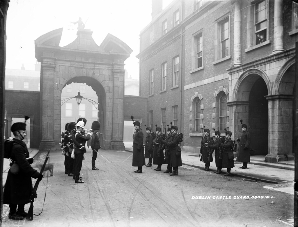 Changing of the guard at the Cork Hill entrance to Dublin Castle, in a photograph of unknown date. Source: www.flickr.com.