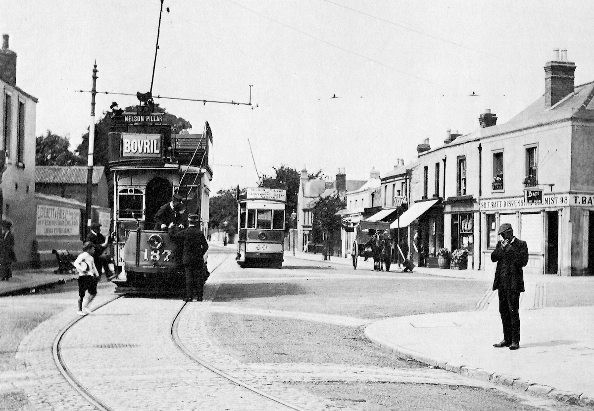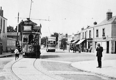Tram at Sandymount Green, bound for Nelson's Pillar in central Dublin. Source: archives of the National Library of Ireland. Reproduced in Cyril Pearl, Dublin in Bloomtime (Viking, 1969).