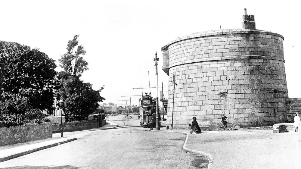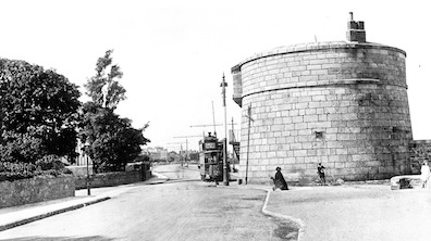 Tram stopped at the Martello tower in Sandymount. Source: archives of the National Library of Ireland. Reproduced in Cyril Pearl, Dublin in Bloomtime (Viking, 1969).