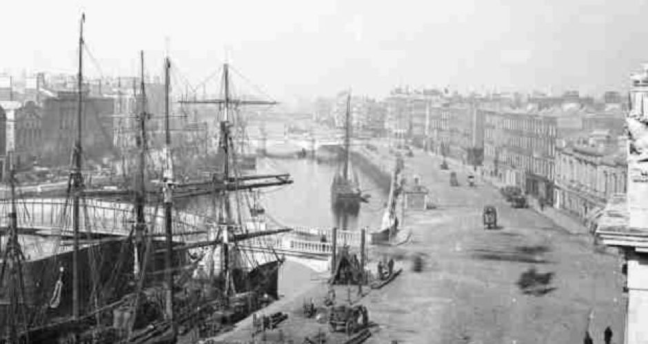 Photograph taken from the roof of the Custom House showing Butt Bridge in the foreground and Carlisle Bridge in the background. The bridge is closed, and ships are moored on both sides. The Loopline bridge is not visible, so the picture must have been taken before 1891. Source: www.irishtimes.com, courtesy of the National Library of Ireland.