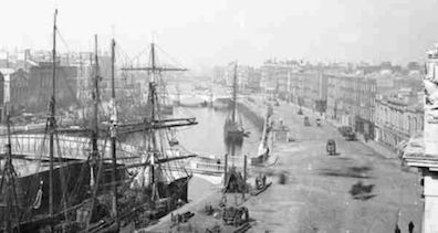 "Butt bridge," in 1904, was an unglamorous but practical steel swivel bridge across the Liffey, a little east (downstream) of the O'Connell Street bridge (then called the Carlisle bridge). When its rotatable deck pivoted parallel to the quays, it allowed ships to pass up to that central point in the city.