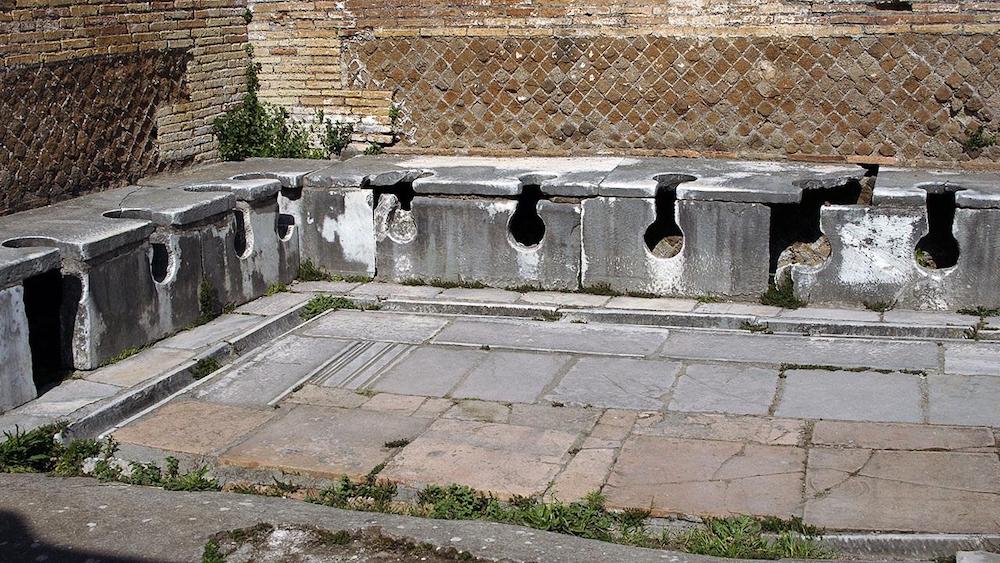 A Roman watercloset of the 2nd century AD, its toilets facing water-filled troughs where patrons could dip the cloth-covered sticks that did the work of toilet paper. Source: www.sciencemag.org.