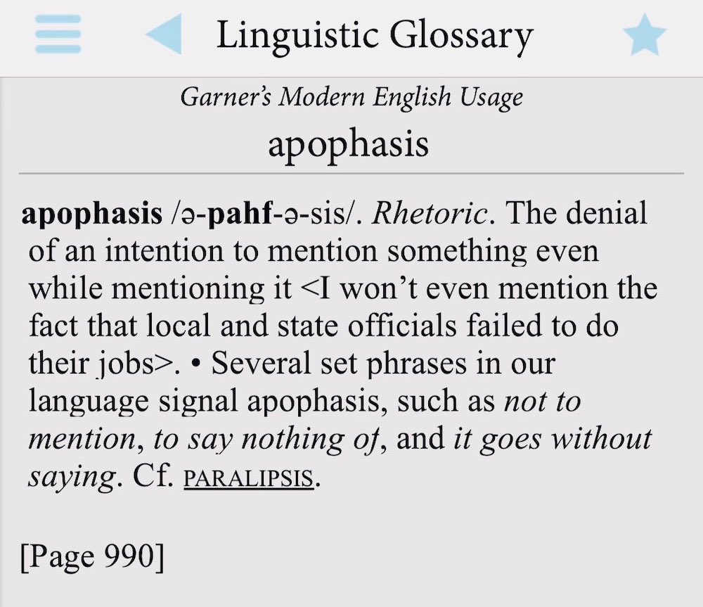 Apophasis (uh-POF-uh-sis, from Greek