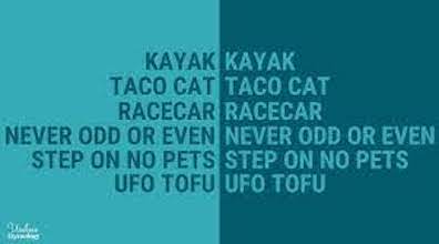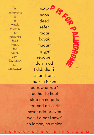 Palindrome (PAL-in-drome, from Greek palin = again +