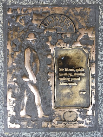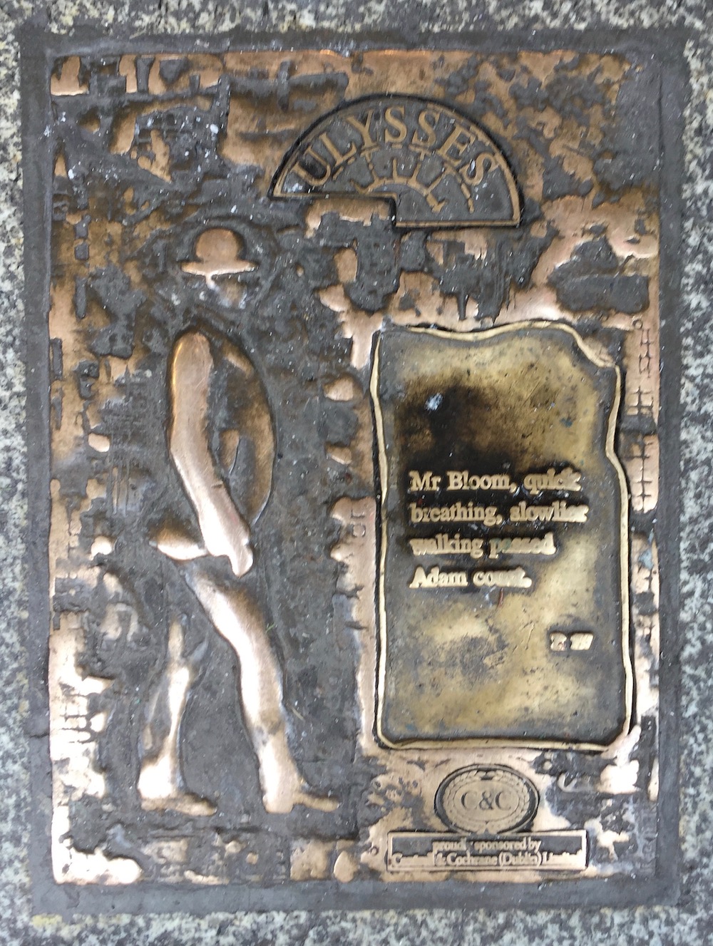 2019 photograph of a well-worn bronze plaque by Robin Buick embedded in the Grafton Street sidewalk in front of Adam Court. Source: John Hunt.