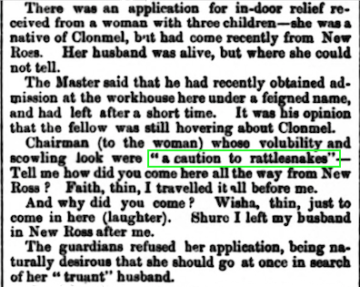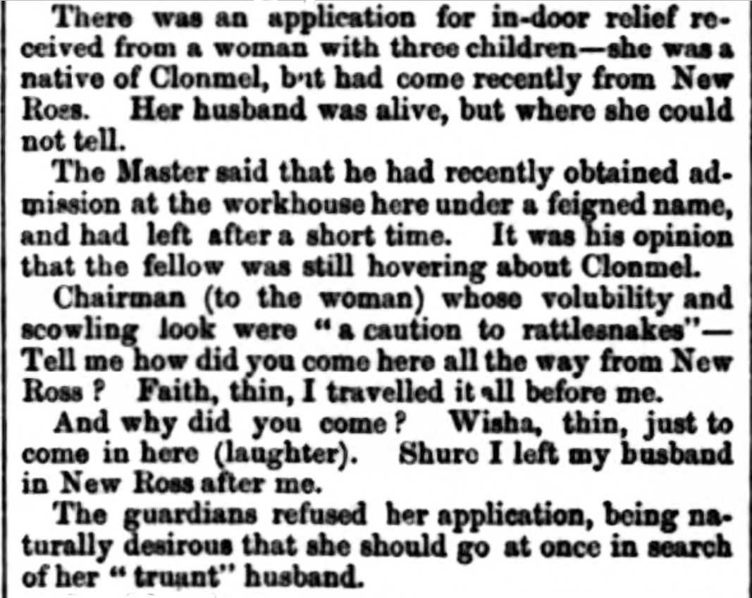New Ross to the poor-house in Clonmel seeking relief, noting