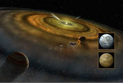 principle: first there is hot gas, then a solid planet, then an inhabited world, and then the