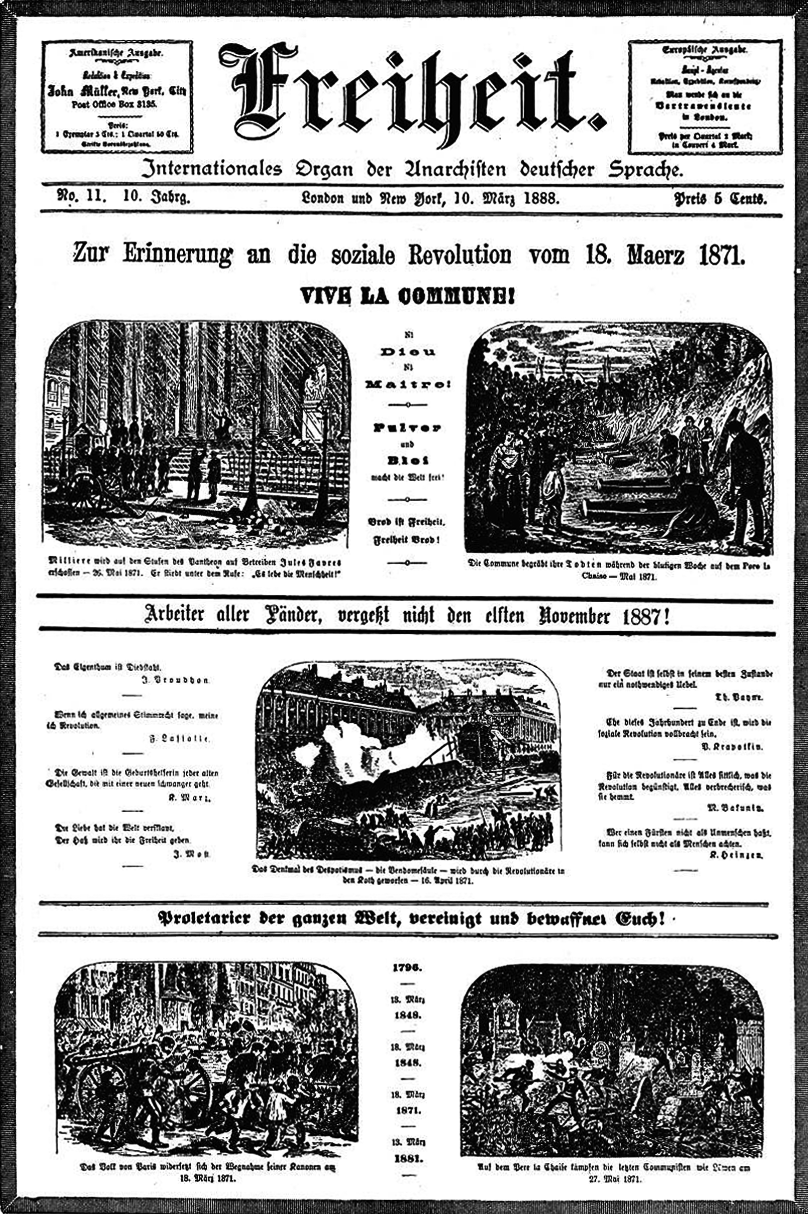 themselves. At Most's feet his newspaper Freiheit proclaims,