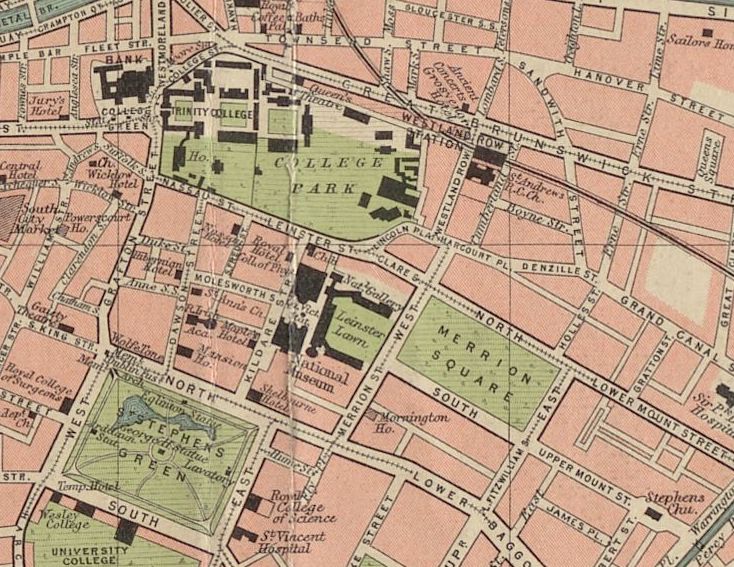Moving on, Farrell walks west on "Clare Street" past "Mr