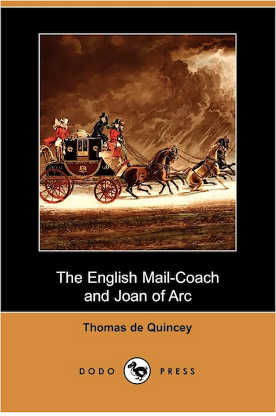 Joyce's parody captures the quality of what De Quincey called his "impassioned prose," and it borrows one or two words from Opium-Eater, but it does not sound much like any section of that work. In his study of the sources of Oxen's styles, however, Robert Janusko suggests a debt to The English Mail-Coach (1849). Section 3 of that work, a series of opium-like reveries titled "Dream Fugue," tells a very different story from Joyce's parody, but it contains what Janusko calls a "similar sequence of images" (72-73). All of them are hallucinatory responses to the fear of mortality raised in section 2, "The Vision of Sudden Death," where De Quincey recounts a near-accident between a massive mail-coach and a small carriage holding a young couple.