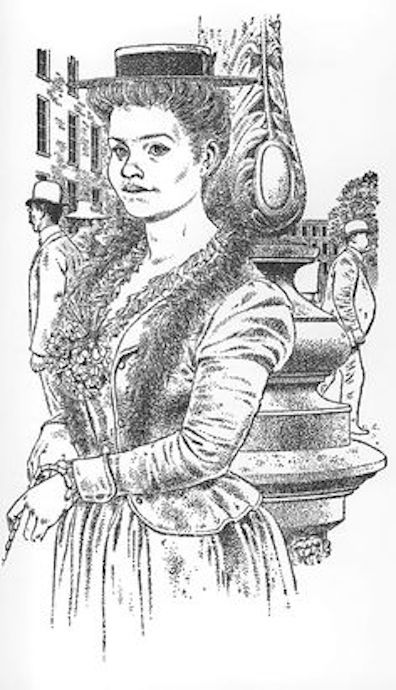 unseen. She is in her "Sunday finery": a blue dress, a white