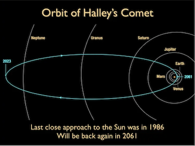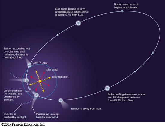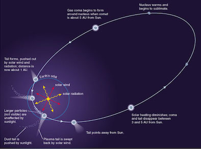 Comets have "almost infinite compressibility" in the sense that their spectacular tails are composed of tiny particles of dust and water vapor that the sun's intense radiation has boiled off a traveling ball of ice and rock. Also long are their "vast elliptical egressive and reentrant orbits," which in reentry take them to a point near the sun ("perihelion") and in egress to a point far away from it ("aphelion"). Only in close proximity to the sun do comets put on the wonderfully "hirsute" shows that awe human beings––Finnegans Wake calls them "creamtocustard cometshair" (475.15) and imagines "combing the comet's tail up right and shooting popguns at the stars" (65.10-11). When they return to the deep, dark, cold haunts of the outer planets, these iceballs "chancedrifting through our system" (FW 100.33-34) fade away into obscurity.